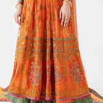 • Elegant long-sleeved orange Anarkali with intricate net embroidery