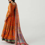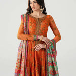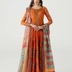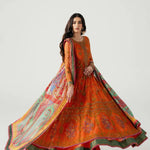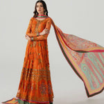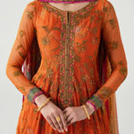 Step into vibrant elegance with Mahlaqa Bai, a long-sleeved orange Anarkali from Ruuposh Collection. Crafted with intricate net embroidery over a printed lawn underdress, this flowing silhouette exudes sophistication and festive charm.