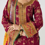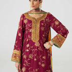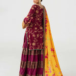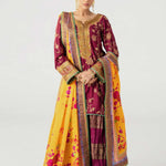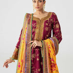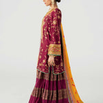 Step into the grandeur of the Jalsa Ghar Collection with Tojis, a breathtaking deep burgundy embroidered Sharara suit designed for the most exclusive festive and wedding celebrations. This majestic ensemble embodies traditional opulence with its commanding colors and intricate artisanal gold work.