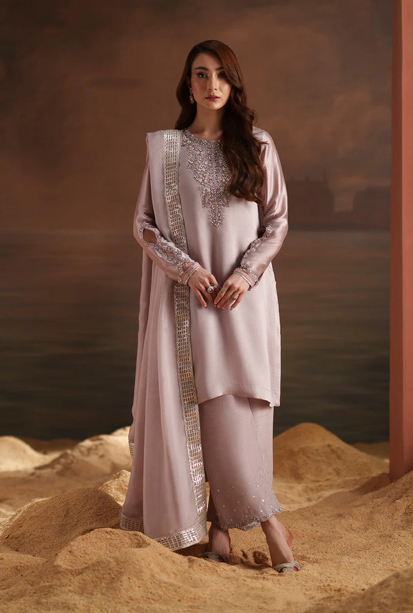 Work Technique: Printed & Embroidered Best worn In: All Season Package Includes: 3PC Shirt, Dupatta & Trouser Fabric: Silk Description: Crafted with a polished Sheesha silk shirt for a smooth and elegant silhouette.The Korean...