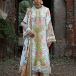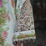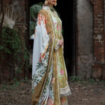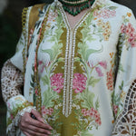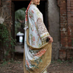 A digitally printed shirt paired with a matching printed trouser, designed to capture effortless sophistication in every thread. The look is elevated with an embroidered organza neckline patti, delicate sleeves border, and an intricately embroidered daman border — a true celebration of detail and artistry. Wrapped in a woolen printed shawl, Gulrukh blooms with elegance, warmth, and timeless allure.