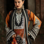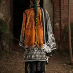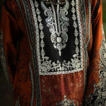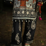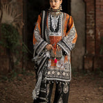 A digitally printed linen shirt paired with a coordinated printed linen trouser, woven in warmth and grace. The ensemble is elevated with an embroidered silk neckline, organza shirt motifs, and delicate borders on the organza sleeves and shirt finishings, each detail crafted to perfection. Completing the look, a herringbone printed shawl adorned with embroidered organza motifs wraps Mahrukh in a touch of elegance and poise.