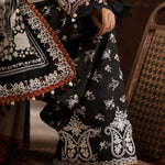 An ivory khaddar fabric shirt adorned with black printed elements, paired with black sleeves detailed in ivory prints - a perfect balance of grace and contrast. A floral mix with paisleys, touched with deep maroon printed accents, adds a layer of luxury. The look is elevated with embroidered neckline, maroon silk sleeve borders, and delicate embroidered lace on shirt sides. A printed khaddar trouser with an embroidered border completes the set, while the statement herringbone shawl - featuring paisley accents on ivory - wraps it all together in warmth and charm.