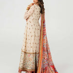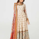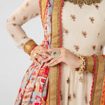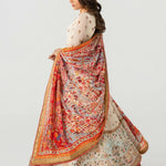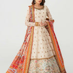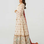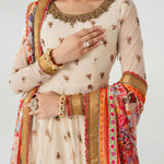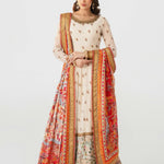 Ivory long-sleeved dress that has delicate embroidery on the bodice and sleeves. The dress has a flowing skirt with a landscape patterned hem on net with underbody in lawn in tier style. A vibrant printed dupatta in silk finished with embroidered and banarsi boarders, paired with sharara pants and finished with banarsi boarder.