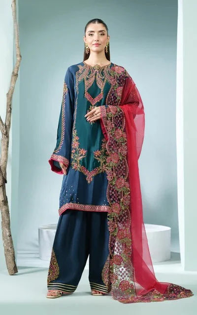 Shirt:This shirt is made from Viscose fabric. It is beautifully fully sequence embroidered, including on the arms, sleeves, and daman. Trouser:   This outfit includes a beautiful embroidered Farshi Shalwar with...
