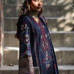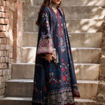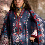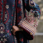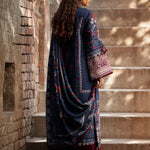 A digitally printed khaddar shirt paired with a matching printed khaddar trouser, brought to life in soft textures and timeless hues. The artistry unfolds through embroidered silk sleeve borders — 1, 2, and 3 — each telling its own story of craftsmanship and detail. An embroidered silk daman border adds the final touch of sophistication, while the herringbone printed shawl drapes the look in effortless elegance. Nilofer — where tradition meets refined modernity.